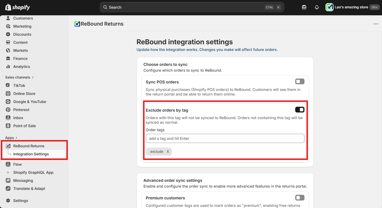 - The Rebound app syncs orders as they get fulfilled. For the exclude order sync by tags functionality to work, order tags must be applied before fulfillments in the order are completed. That includes partial fulfillments.