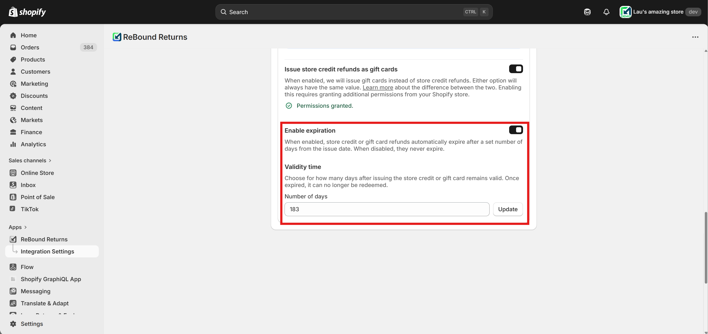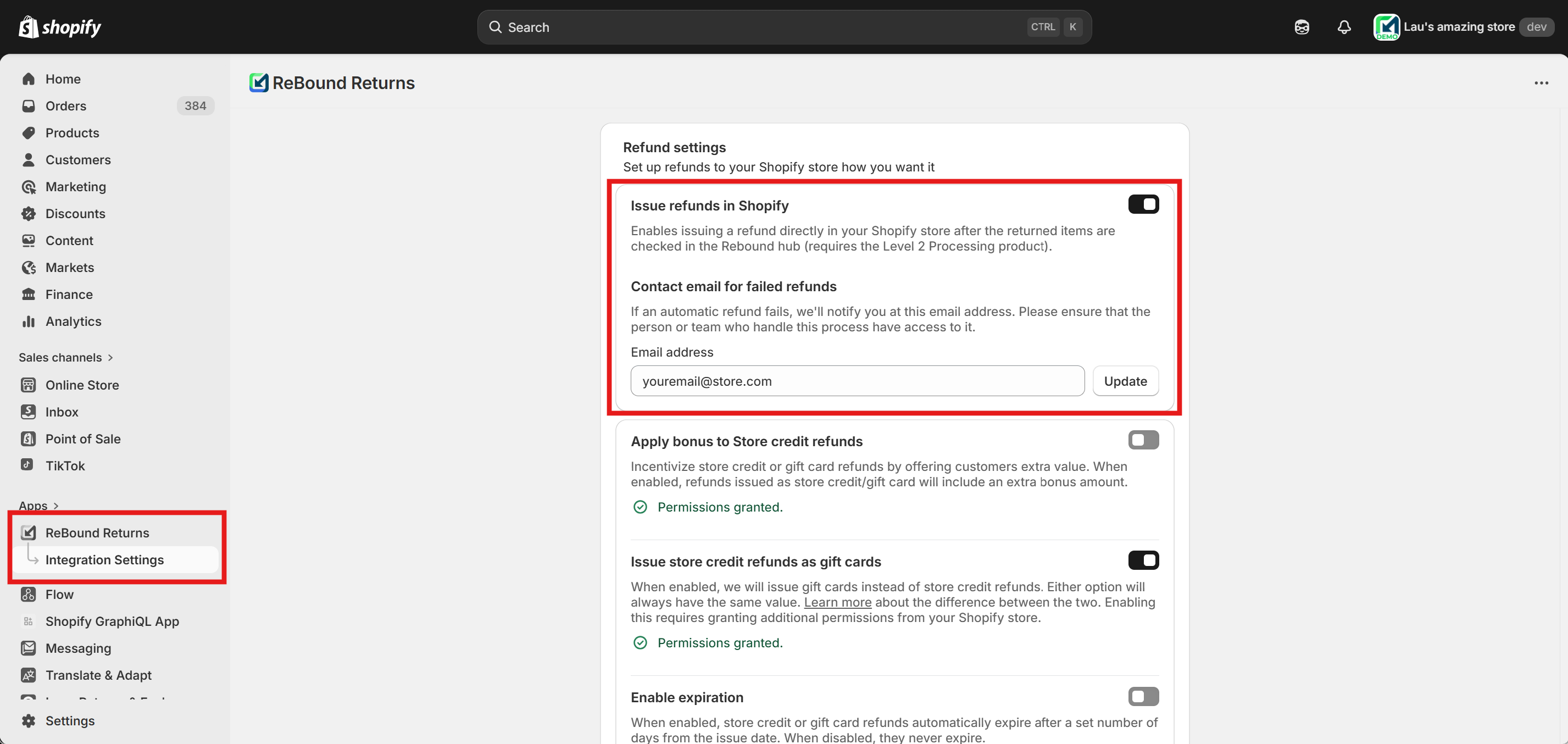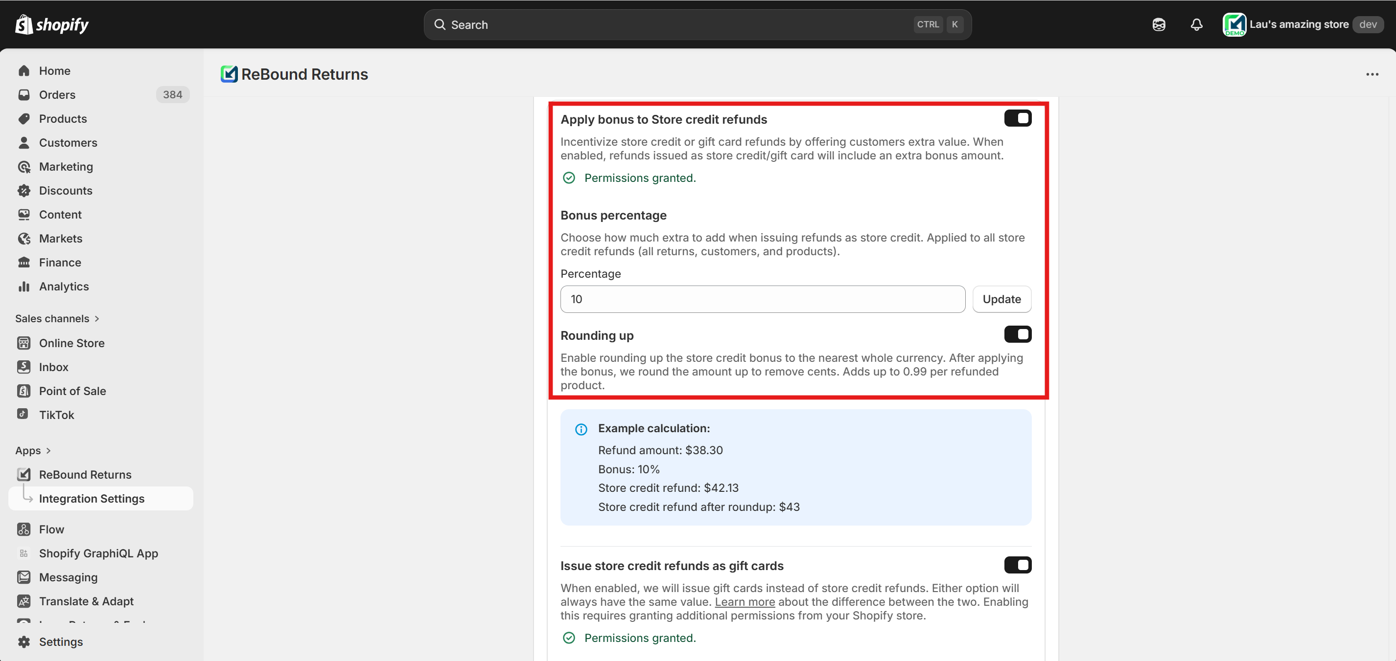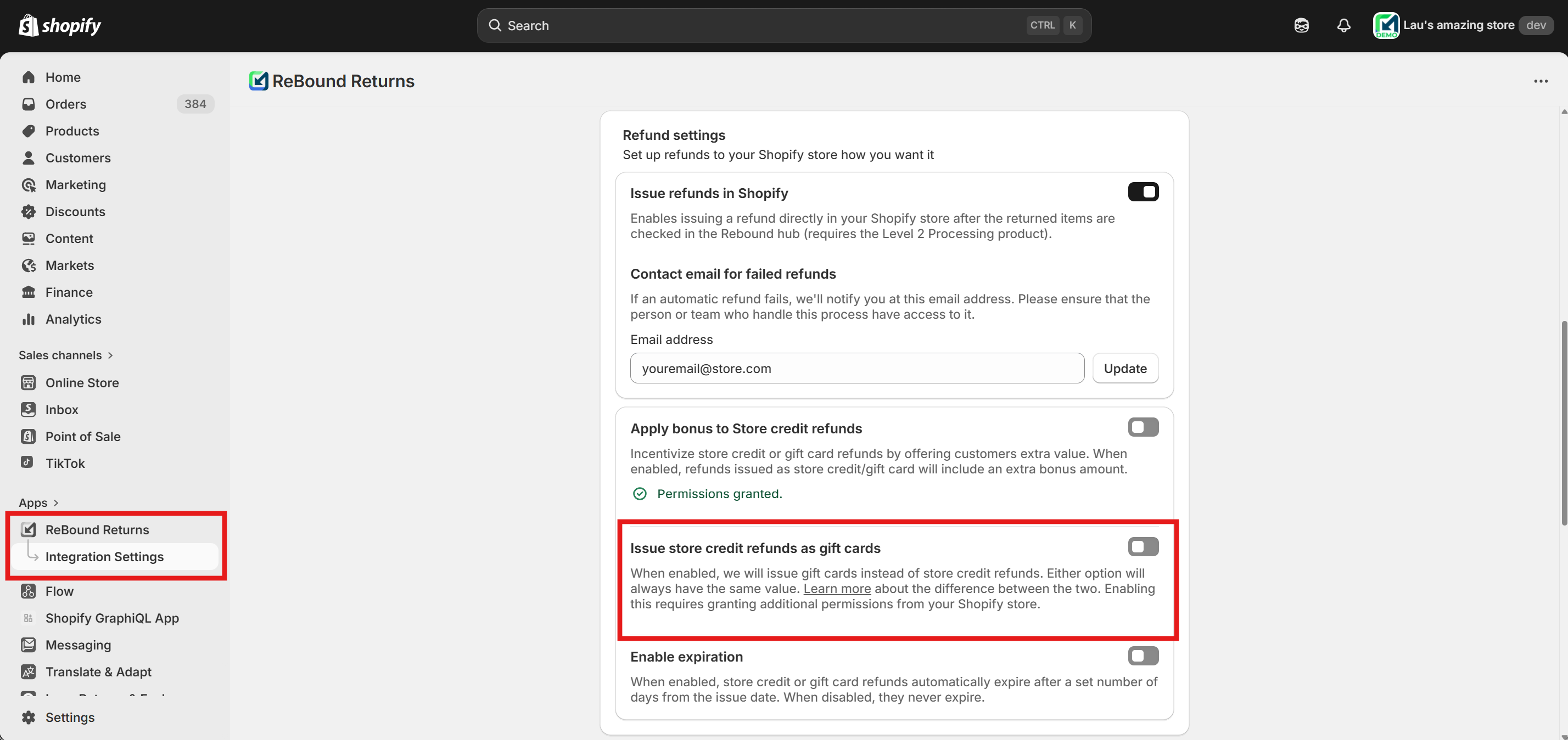 Enable the "Issue store credit refunds as gift cards" feature using the toggle. You will be prompted to approve additional app permissions for gift card management. Approval is required to enable this feature.