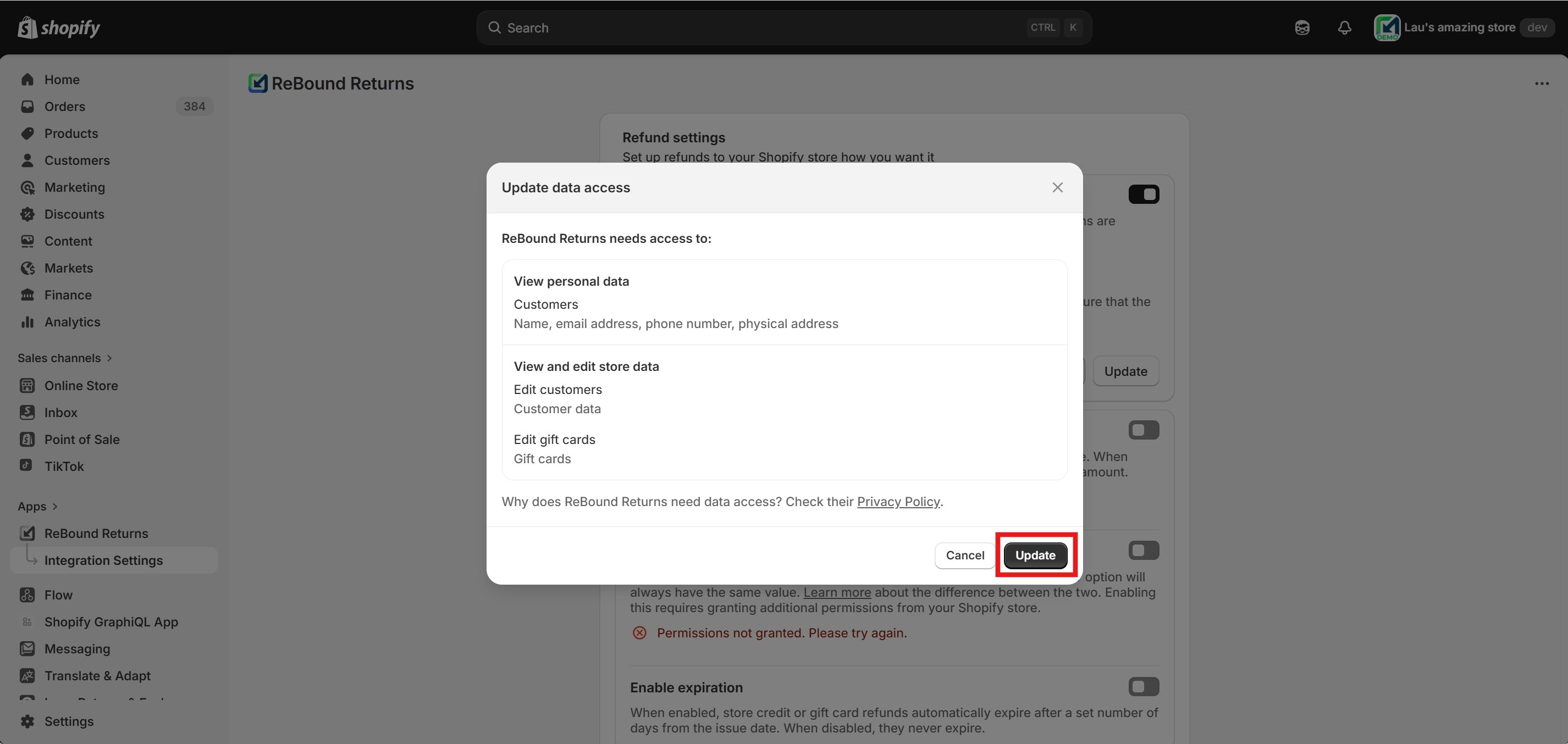 Approving the required permissions for gift card refunds.