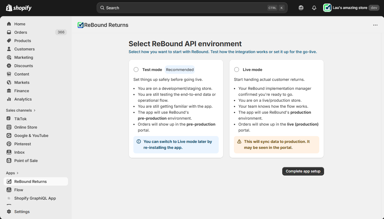 When installing the ReBound-Shopify integration, you can choose between "Test" and "Live" modes. This allows you to configure which ReBound API environment the integration should work with.