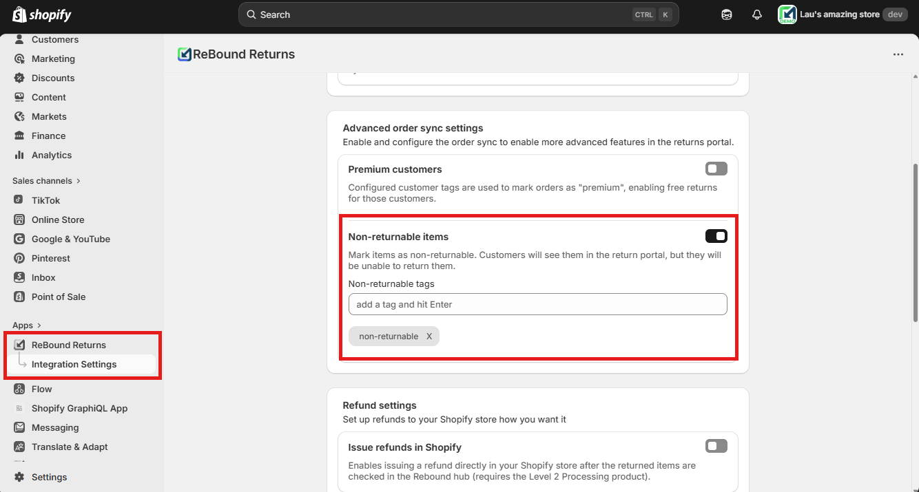 If you want to disable the feature altogether, click on the toggle to the right of "Non-returnable items". Disabling the feature will no longer sync items as non-returnable in new orders. Already synced orders/line items will not be affected.