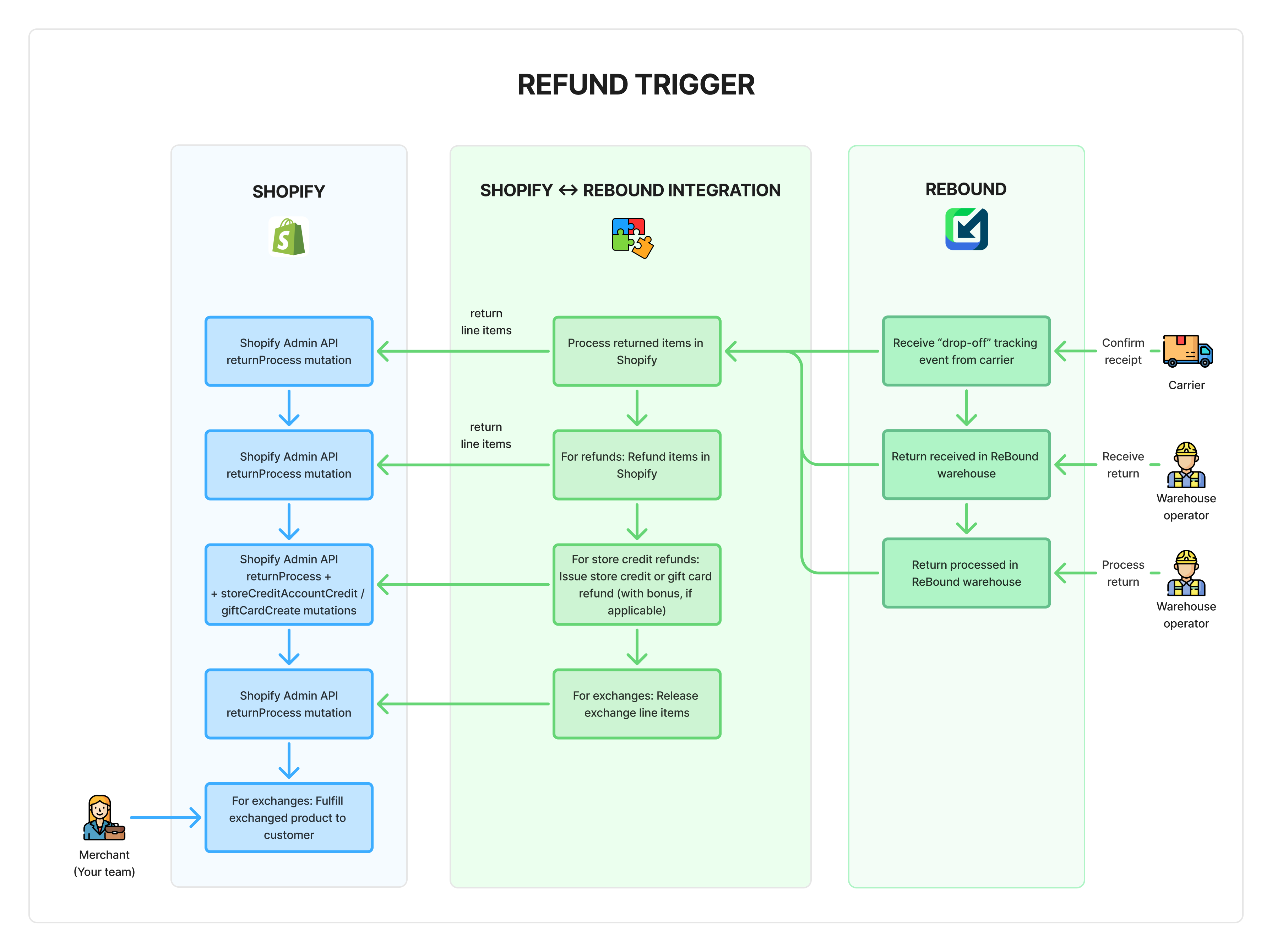 It is possible to trigger a refund using different events in our network: (1) return receipt by carrier, (2) return receipt by ReBound warehouse or (3) return processed by ReBound warehouse.